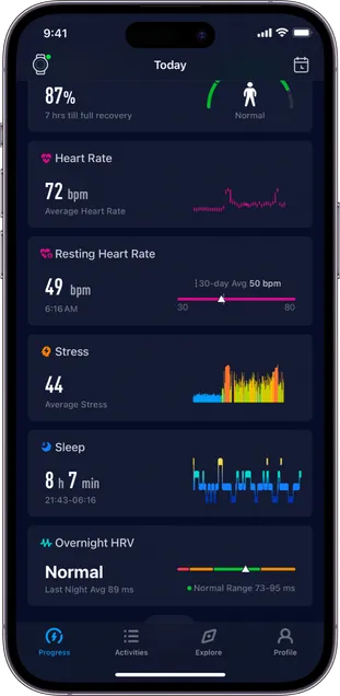 L'entraînement n'est qu'une partie de votre physique. Suivez votre récupération et évitez les blessures grâce à un suivi détaillé du sommeil, de la variabilité de la fréquence cardiaque, un bilan de santé et bien plus encore.