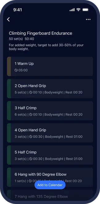 Follow hangboard workouts directly from your watch or mirror them to your phone for key metrics, including the current exercise, time, and heart rate.